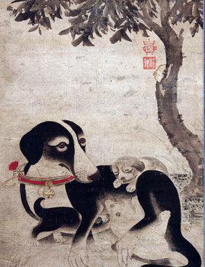 Yi Am (1507-1566), Mother Dog and Puppies, first half of the 16th century. Hanging scroll; ink and color on paper, 163 x 55 cm.