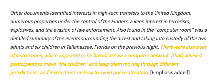 Martinez writes that he witnessed Finders communications regarding the incident in Tallahassee, and instructions to move an unknown number of children as well as instructions on avoiding police detection.