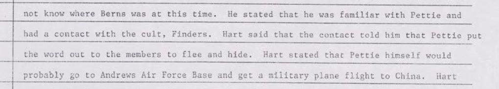 Lt. Lee Hart of Culpeper Virginia is recorded as having stated that he had had contact with the #Finders, and that “Pettie himself would probably go to Andrews Air Force Base and get a military plane flight to China.”