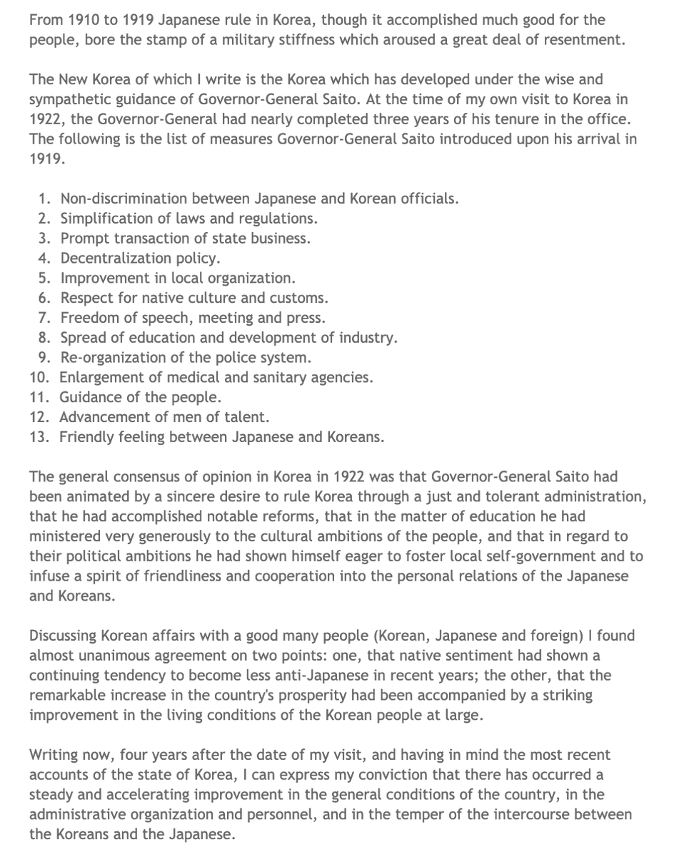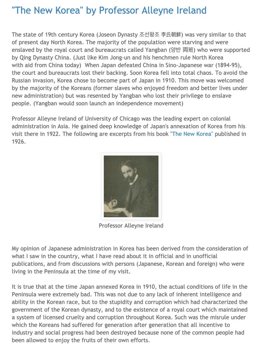 Professor Alleyne Ireland "It is true that at the time Japan annexed Korea in 1910,the actual conditions of life in the Peninsula were extremely bad.the stupidity, cruelty&corruption throughout Korea. Koreans had suffered for generation after generation.