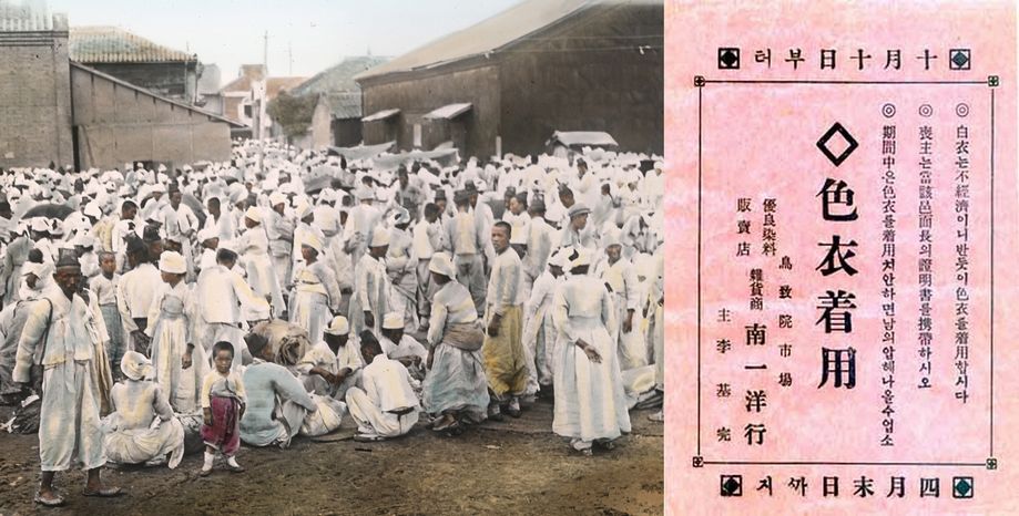 Ad. of Korean dye shop calling for wearing color clothes with the policy of the Governor's Office & Koreans wearing white clothes that were overwhelming at that time.