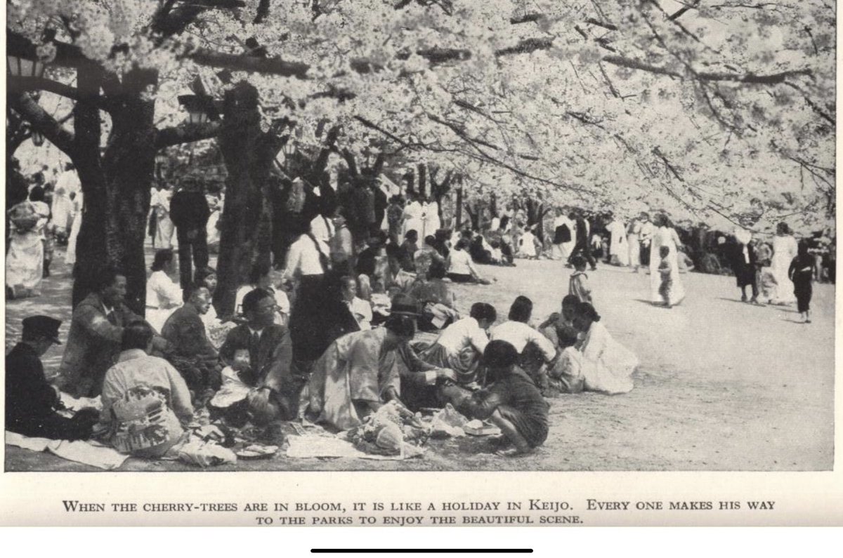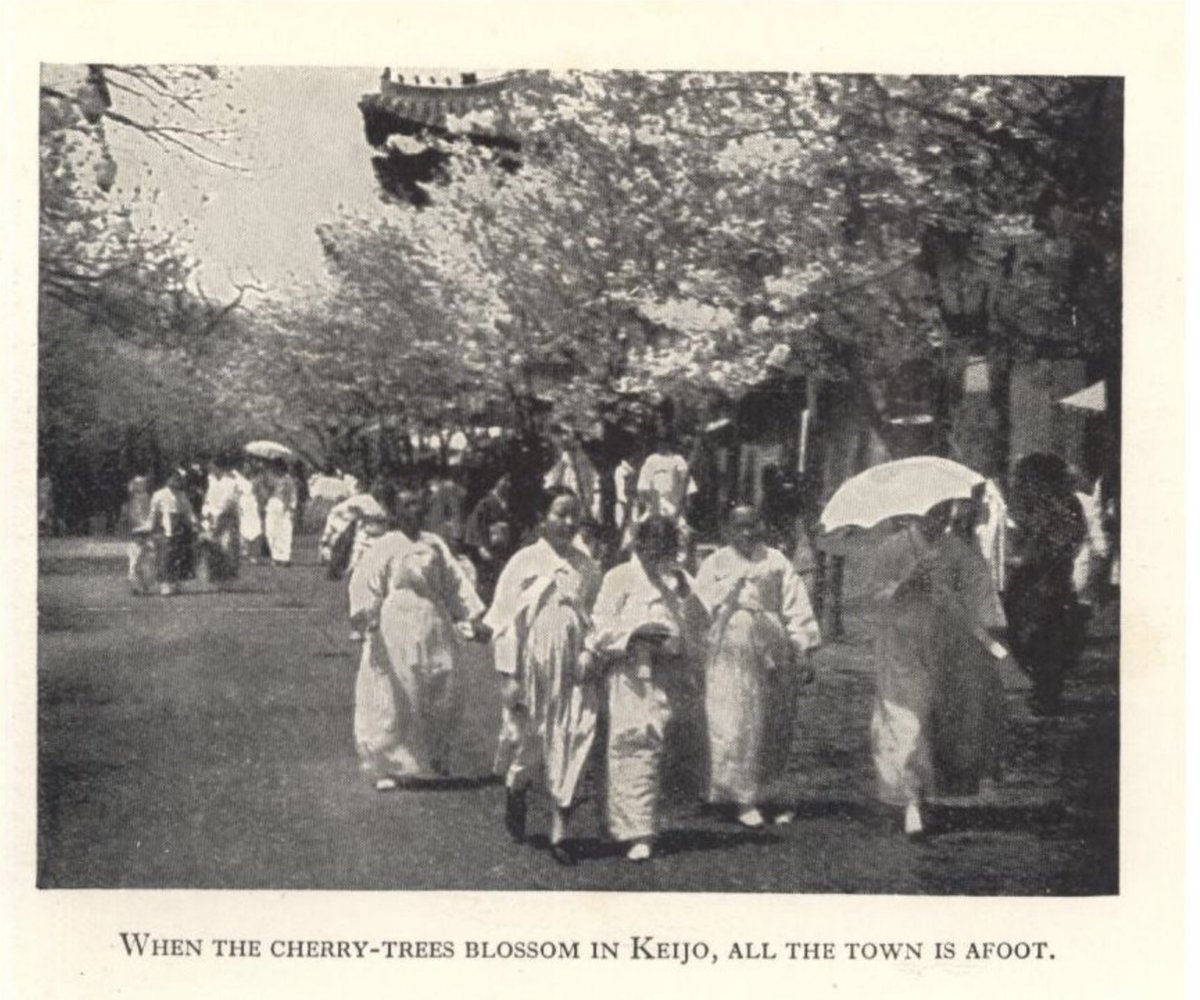 "When the Cherry-trees blossom in Keijo, all the town is afoot. It is like a holiday in Keijo. Everyone makes his way to the parks to enjoy the scene"
