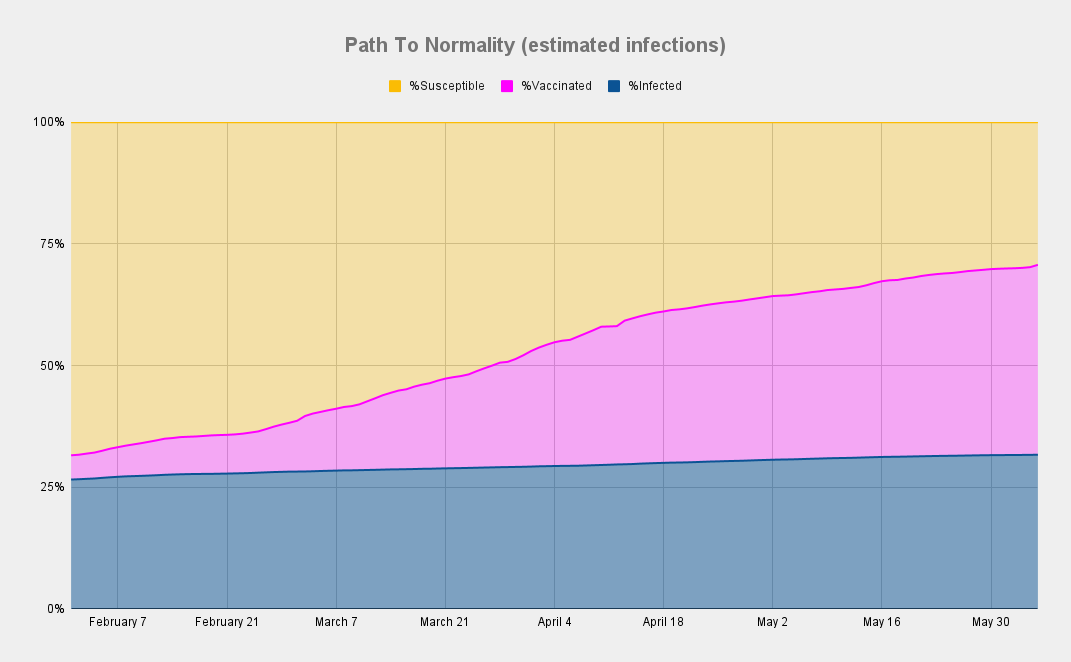 Caveat: Yes, I know, some people who were infected have also been vaccinated. So we have to subtract the overlap to get the true level of community immunity. But we don't have that data. Or at least I don't. So I'm just going to use the rough numbers. Either way, we're there.