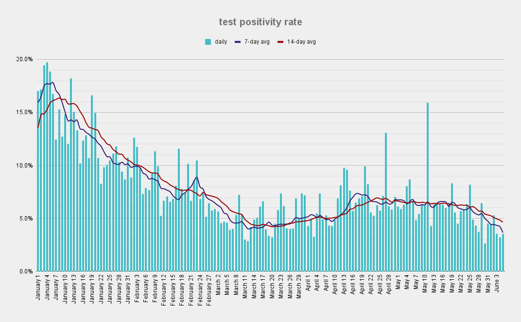 * Positivity: 6.0%, lowest in the past yr except the 4.6% in March