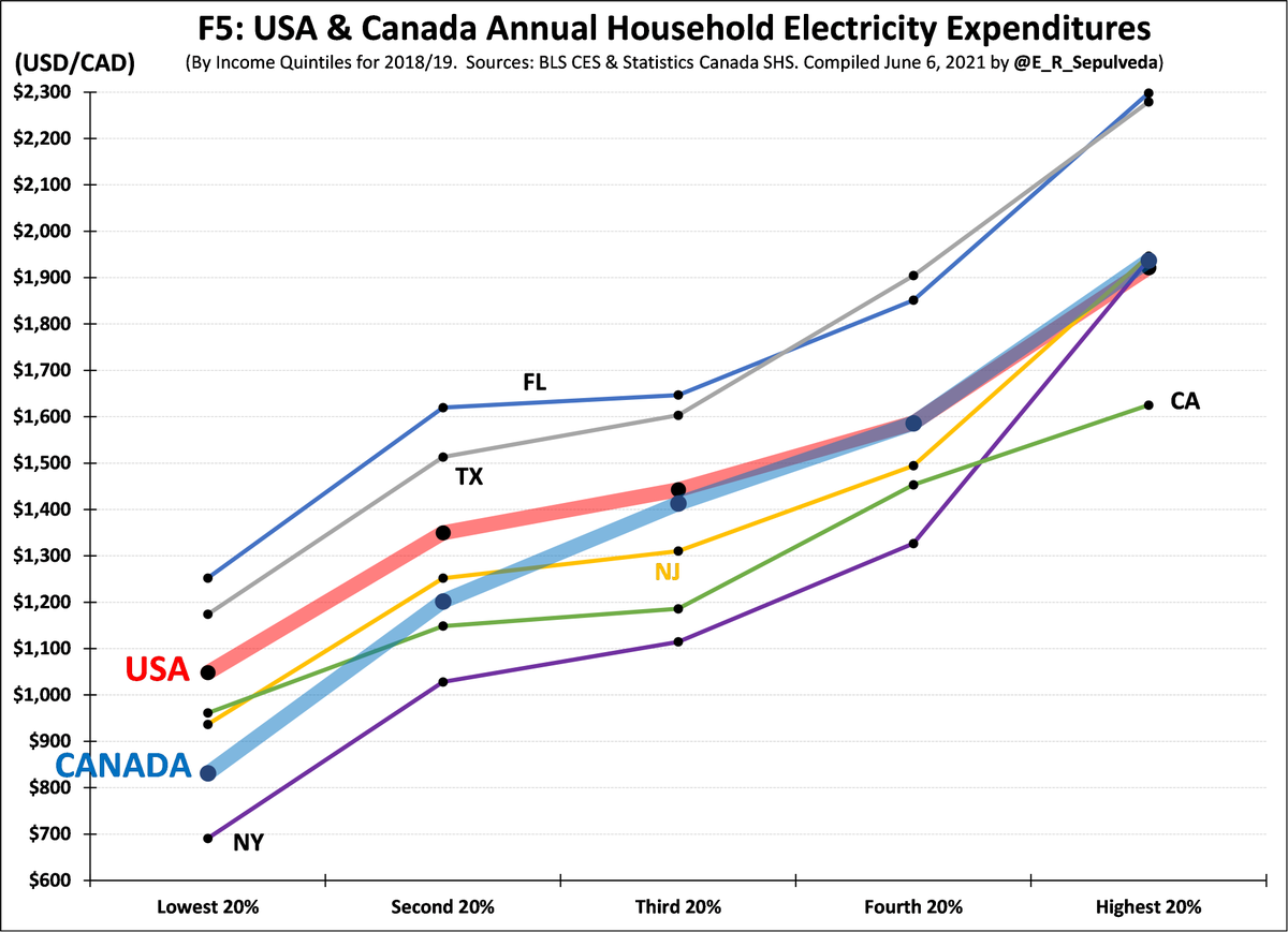 F5 shows avg. household (HH) USA& CAD electricity spending by 5 HH income groups (quintiles (Q), and five USA states