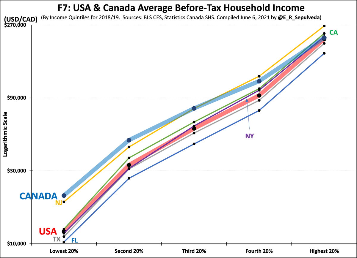 F7 shows the average before tax income for five HH groups for USA, five states & CAD (context)