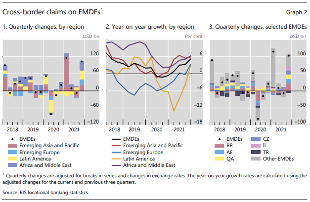 International banks' XB claims expanded 8% yoy, driven by an outsize rise in the market value of derivatives (+$515 billion), especially those reported by banks in the euro area, against the backdrop of elevated uncertainty and market volatility.