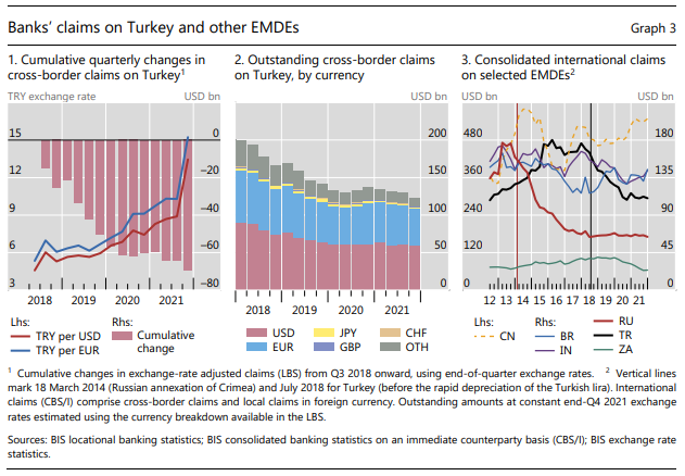 This masks some underlying shifts across geography and sectors. Claims on EMDEs rose substantially ($103 billion) while those on AEs and OFCs declined. Claims on unrelated banks were lower, but rose on related offices and on non-financial borrowers. Also up fo USD, down for EUR