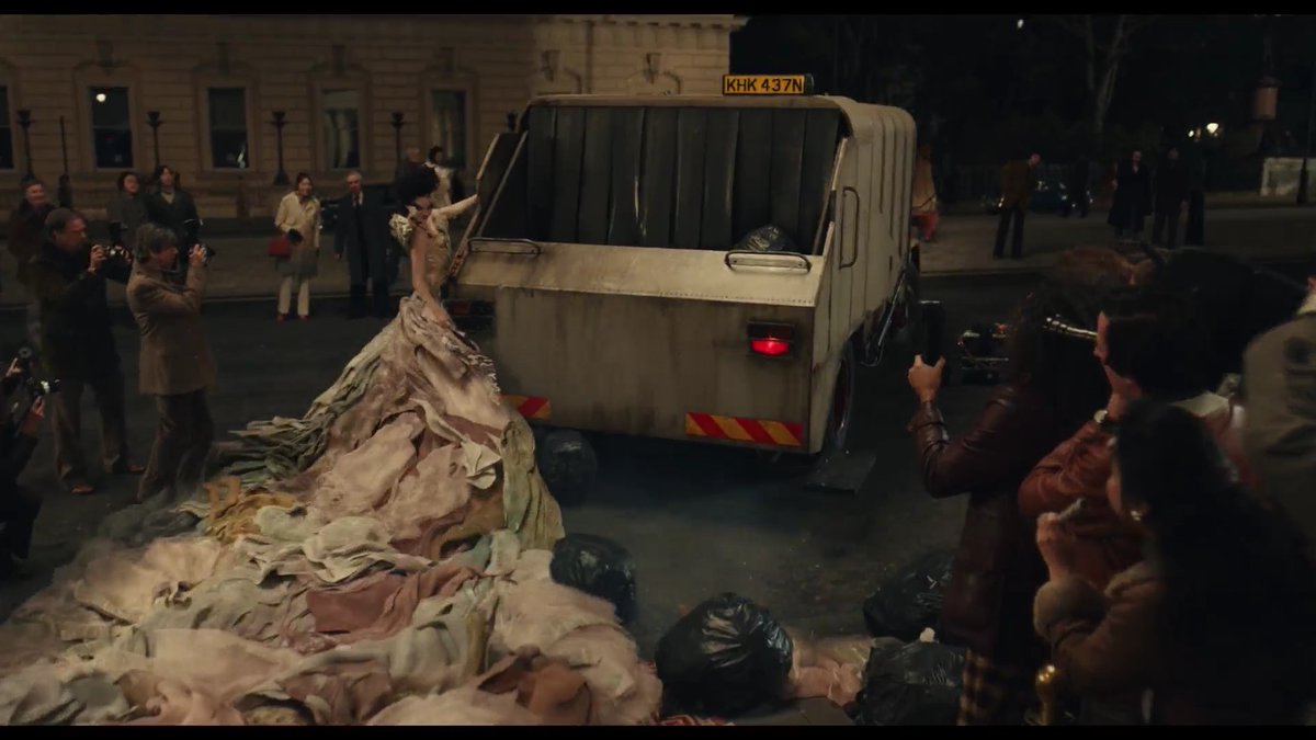 Me parece más simbólico que tomara un traje de segunda de la baronesa para *Mejorarlo*. Pasa de ser una prenda escultural y pulida a ser una envoltura de girones que ascienden como llamas (y guiño fijo a este look de Glenn)