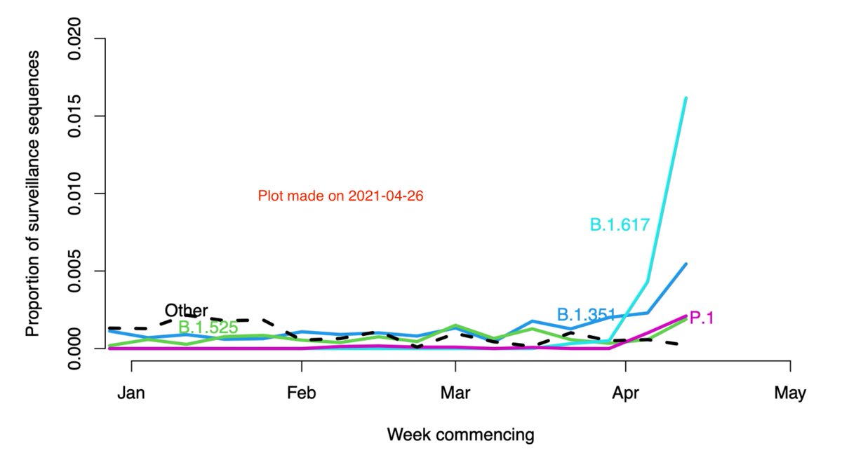 A few thoughts on the B.1.617 variant, first seen in India in late 2020, recently seen in >100 cases in the UK, and very much in the news here. TLDR: we should watch carefully, but I don't think any of our best lines of evidence on variants are yet cause for concern. 🧵