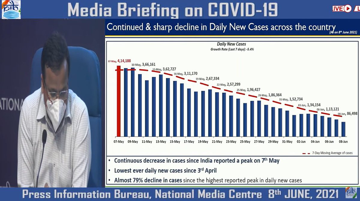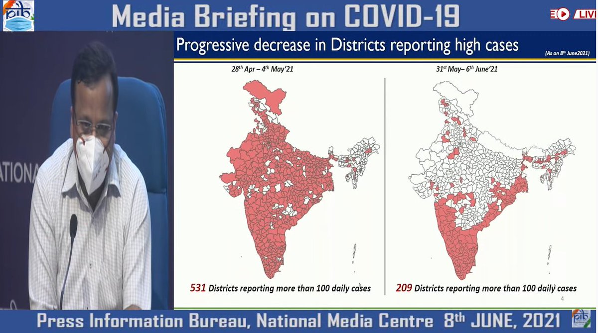जास्त रुग्णसंख्या नोंदवणाऱ्या जिल्ह्यांच्या संख्येत घट, 28 एप्रिल ते 4 मे दरम्यान ही संख्या 531 वरून 209 झाली असून या जिल्ह्यात दैनंदिन >100 रुग्णांची नोंद होत आहे.