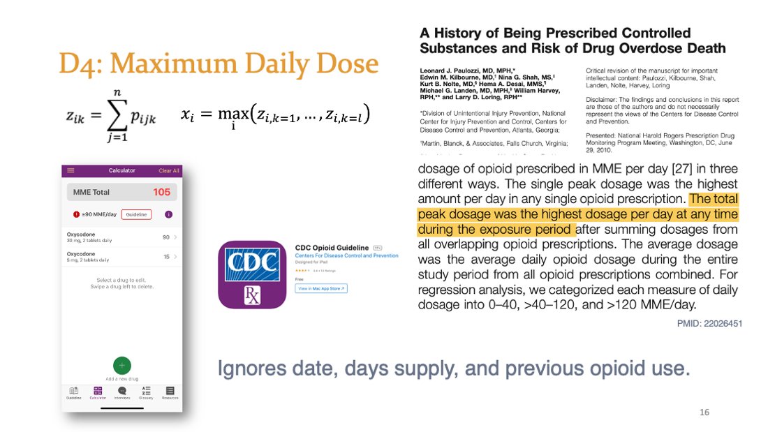 Which definition to use? I like D2 in general, but D3 is good for long-term use because it is more robust to misclassification. Do not use D1. If toxicity is short-term in opioid naive patients, D4 could possibly maybe be sorta acceptable.