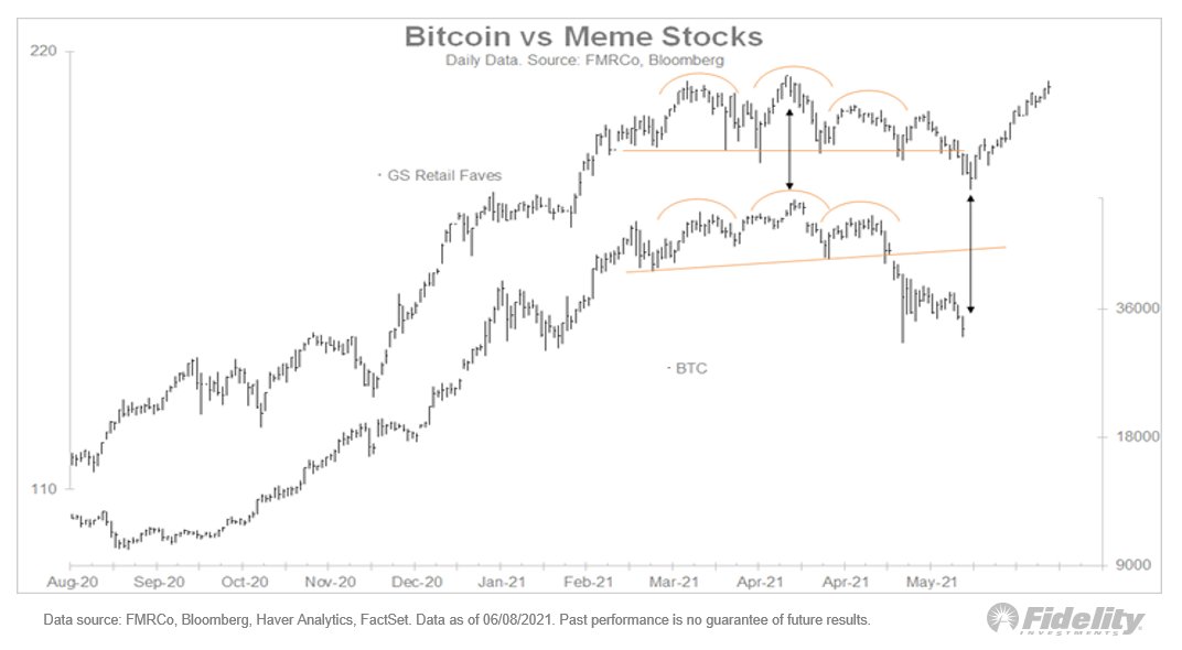 Another positive development is that BTC has followed the general boom/bust pattern of the meme stocks (with a one month lag). This suggests that we are now in the general time zone for a low. /4