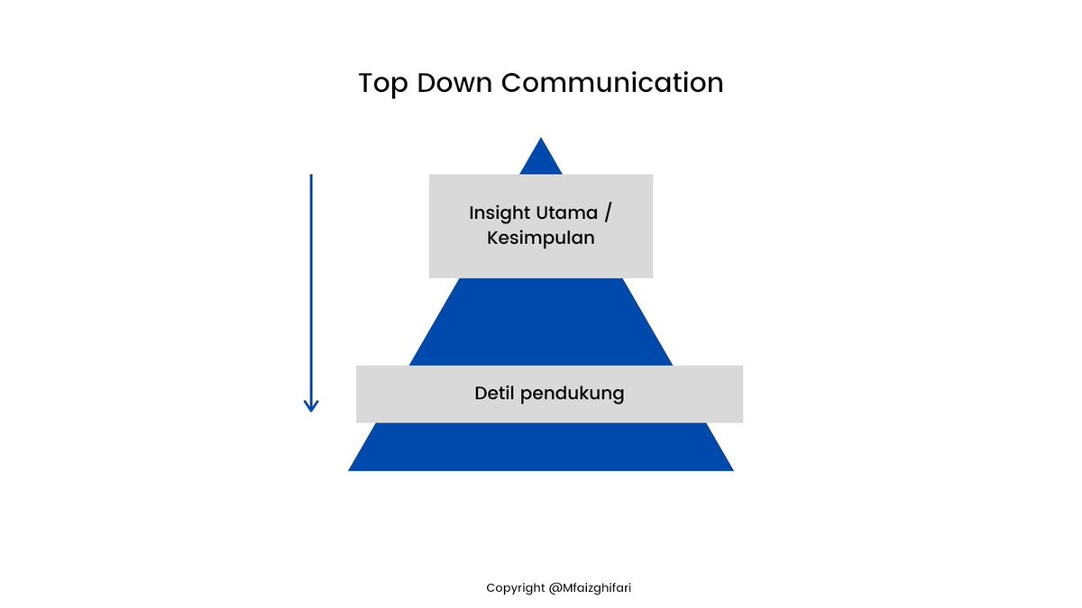 Top Down Communication dimulai dari menyampaikan insight pokok/kesimpulan baru kemudian menyampaikan data data dan insight pendukung