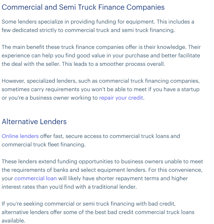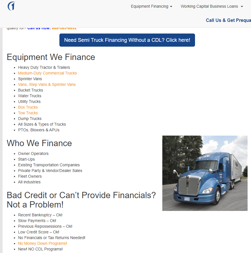 One of the elements that caught my eye was a graphic the page starts off with... it really helps the reader understand not just how to get a loan or where to get a loan but helps the reader get a grasp on the trucking industry from a financial POV. It helps give context.