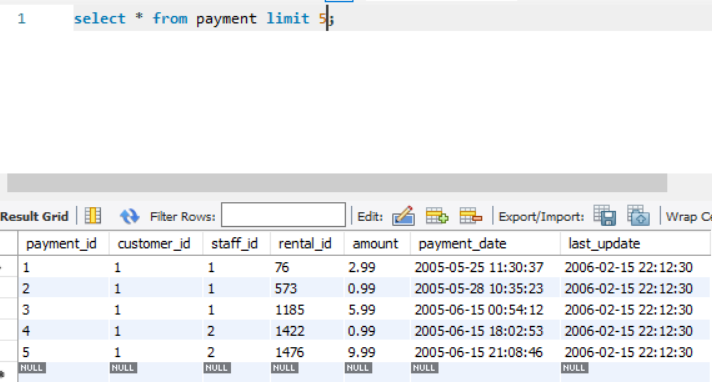 To fetch only 5 rows from the PAYMENTS table, we write a query as follows:-