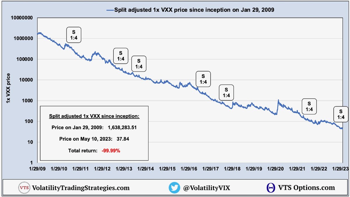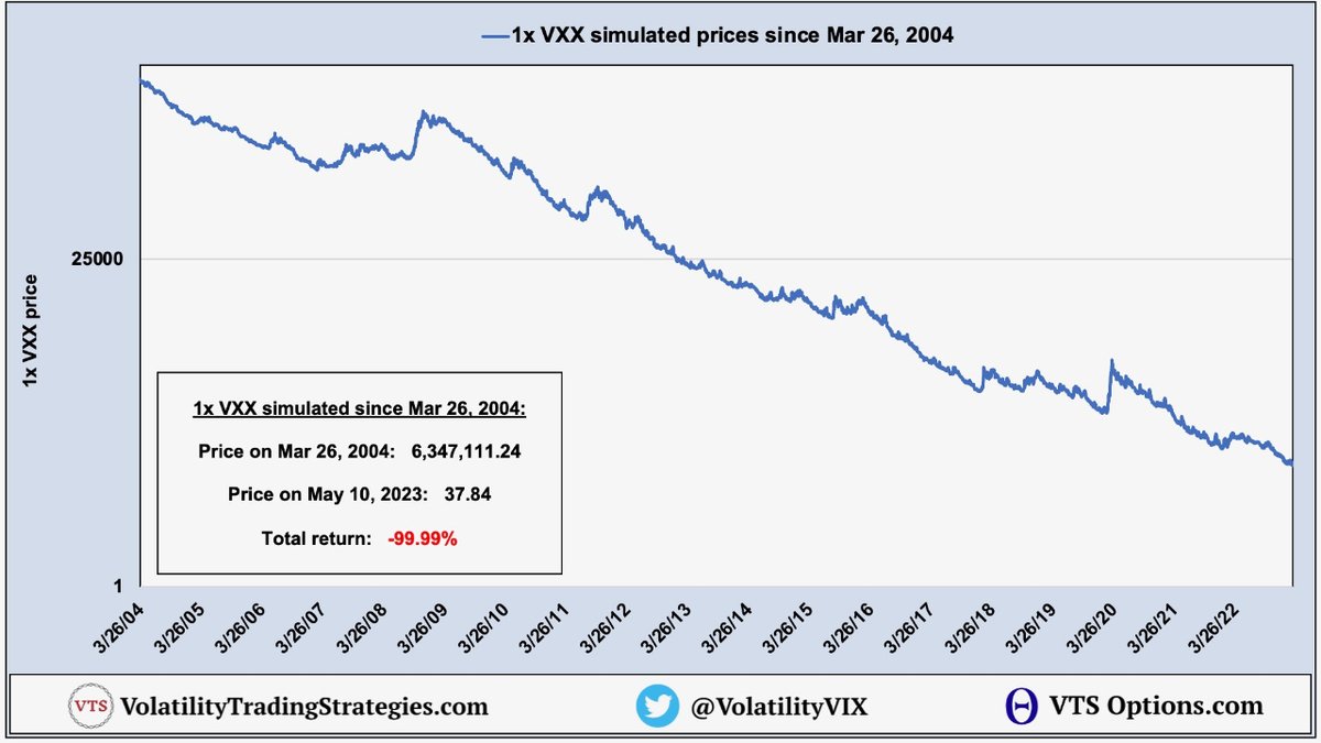Even though VXX launched live in January 2009, because it's entirely based on VIX futures we can simulate its values back to the launch of VIX futures on Mar 26, 2004