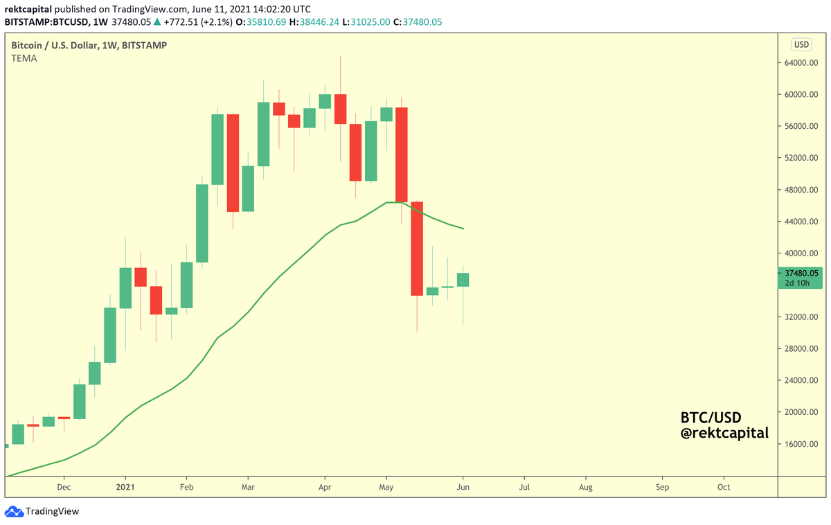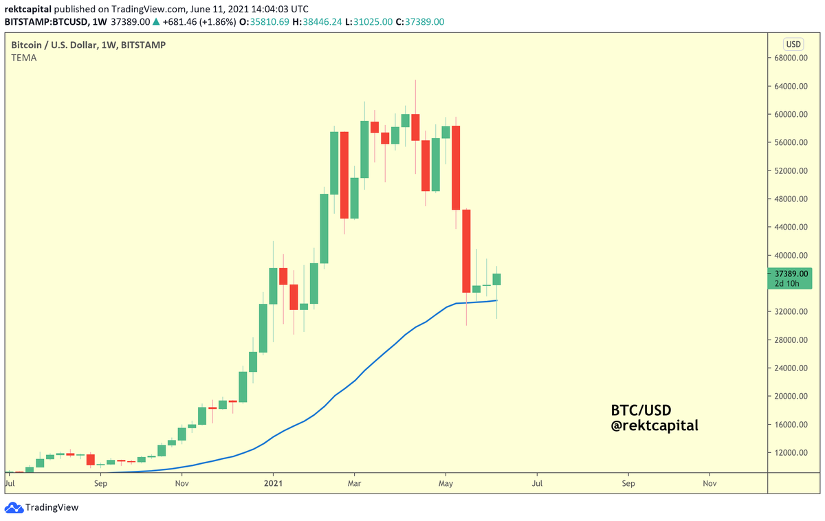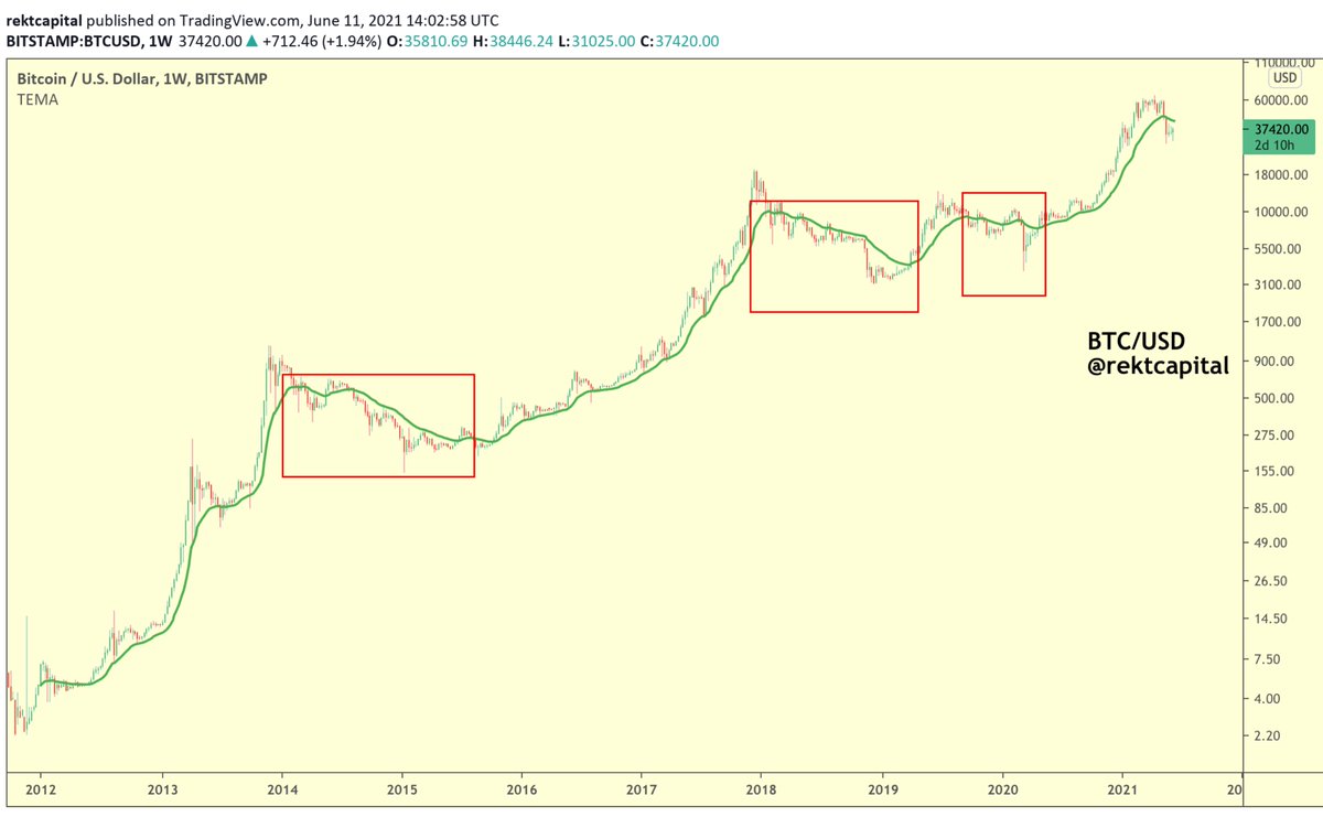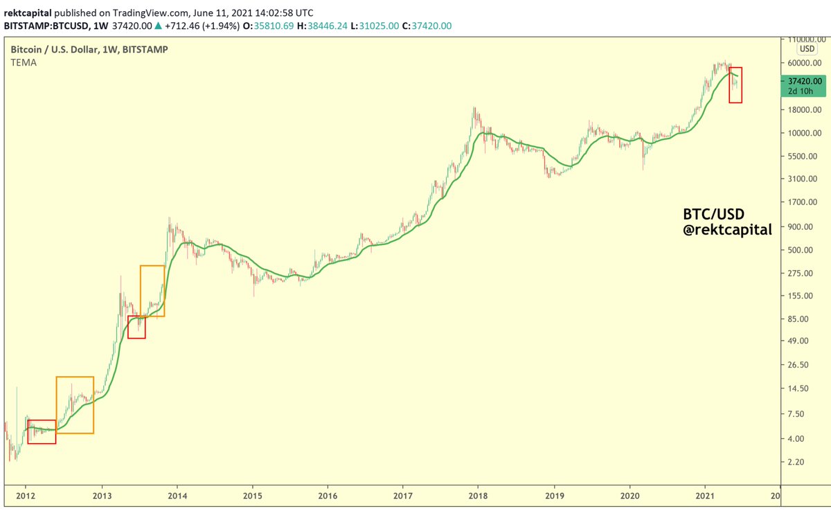 It's really important that the 21 WEMA doesn't turn into resistance upon a $BTC recovery towards the low $40,000s (i.e. the price level where the 21 WEMA now resides)