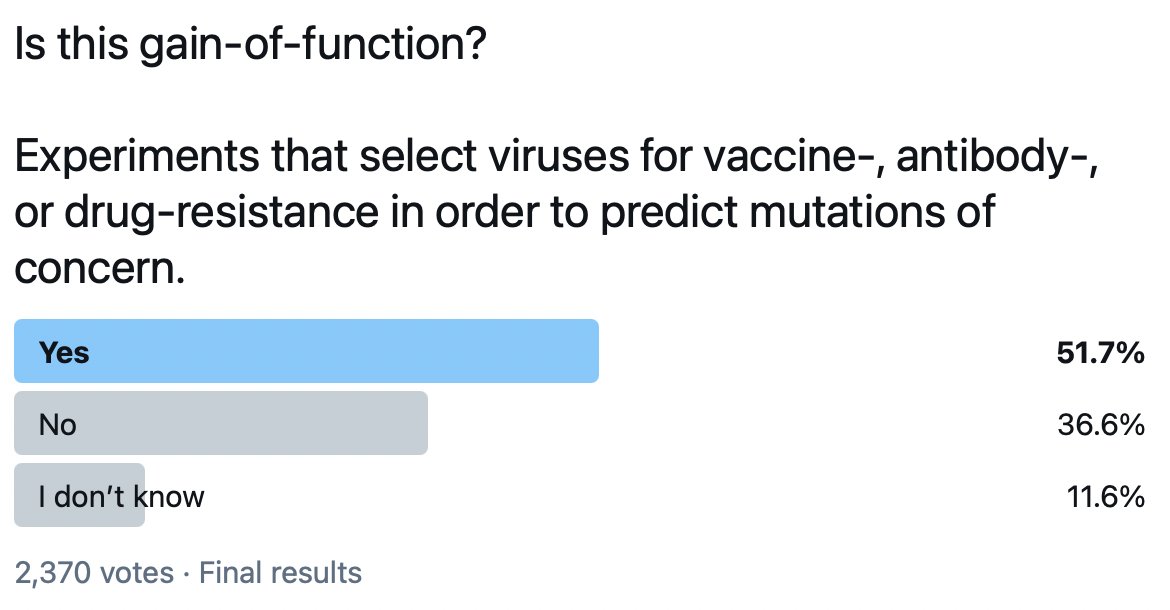 In other words, the survey was not intended to get the specific opinion of experts who have spent the last decade (and more) debating gain of function research of concern (GOFROC) regulation (sorry, @R_H_Ebright).