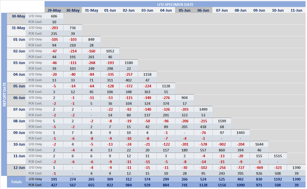Pivot table of daily changes to LFD Only and LFD Confirmed by PCR figures to see if we can identify where LFDs are now being removed due to negative follow-up PCRs.