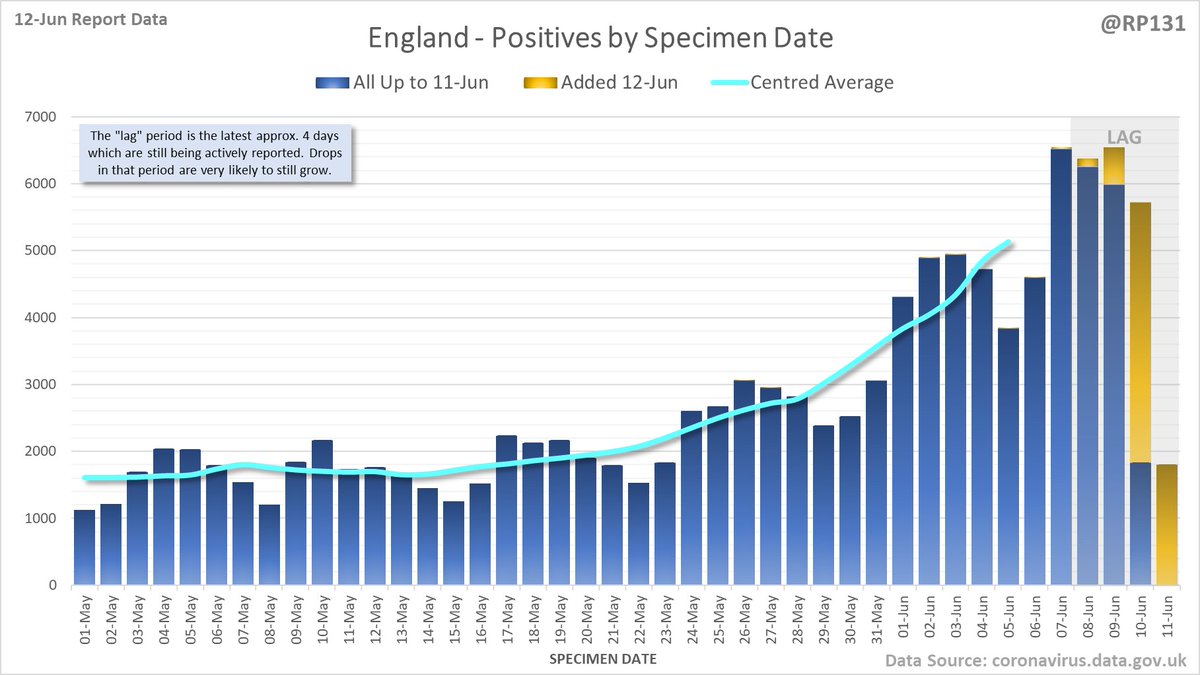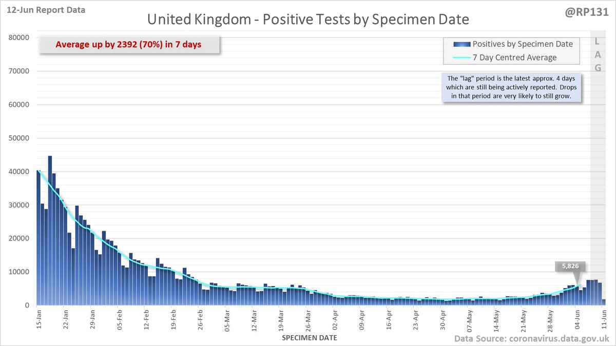 Longer term view. 7,738 new #covid19uk positive tests reported today (12-Jun). This brings the rolling average by specimen date (allowing 4 days for lag) to 5,826, an increase of 2392 (70%) in the last week.