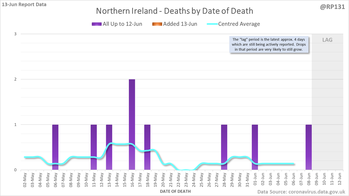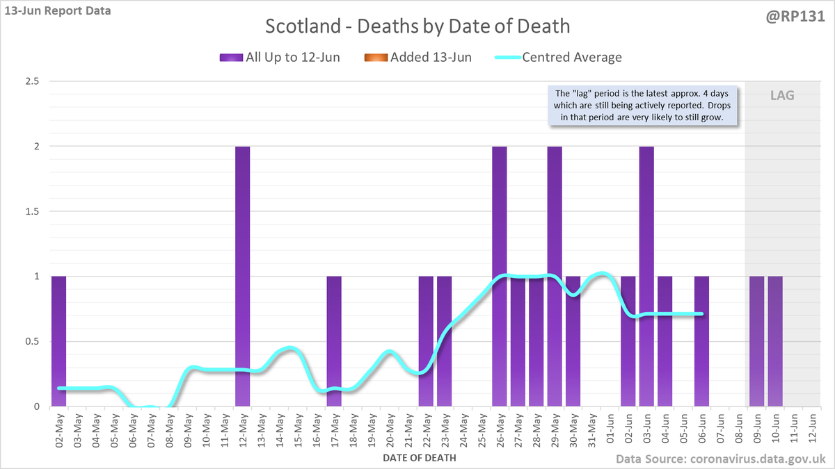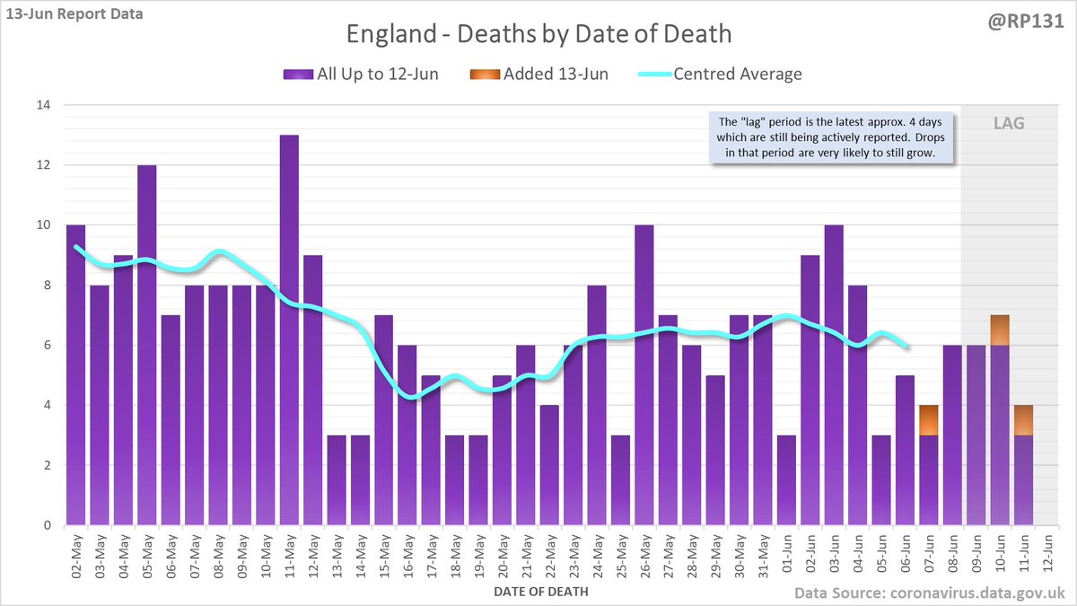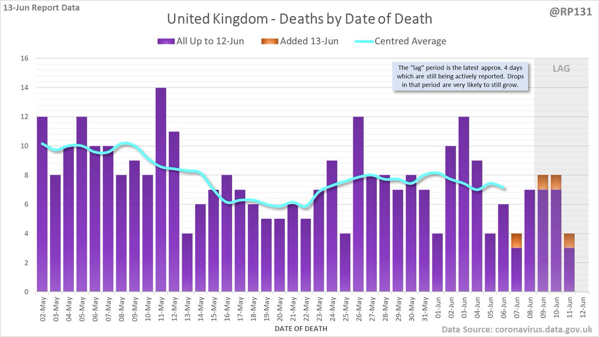 8 new #covid19uk deaths reported today (13-Jun). This brings the rolling average by date of death (allowing 4 days for lag) to 7, a reduction of 0.3 (3.7%) in the last week.