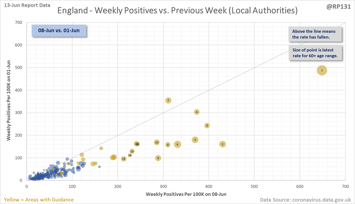 Bubble chart thread for England local authorities. This type of chart allows us to quickly visualise week on week changes by seeing if the points are above or below the dotted line. The size of the dot is the relative level of positives in the 60+ age range.