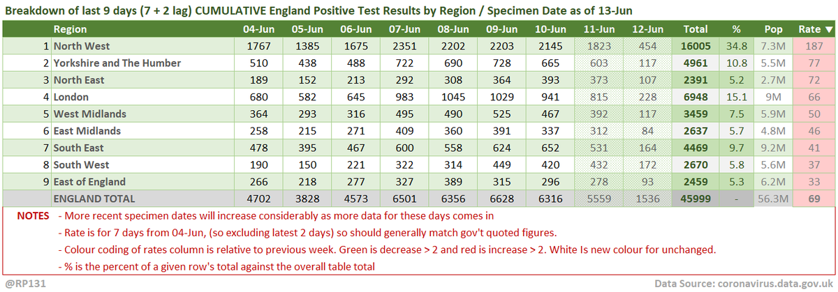 #covid19uk - Detailed positive tests thread. The majority of this thread is a set of views of rolling 7 day average positives per 100K by specimen date. Starting with England regions:
