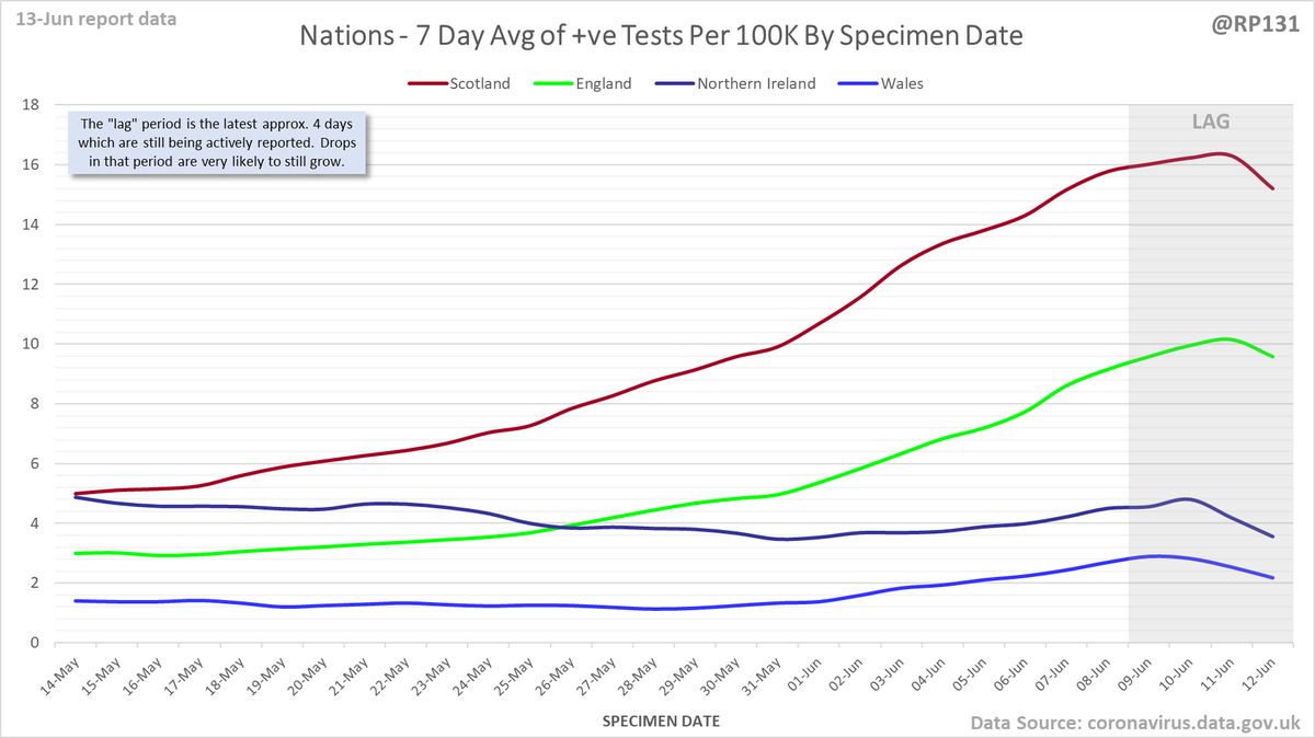 7,738 new #covid19uk positive tests reported today (12-Jun). Given increased use of LFD testing and fluctuations in daily report numbers, I think this is the best chart to lead with as it splits out the test type and has a rolling average of PCR positives by specimen date.