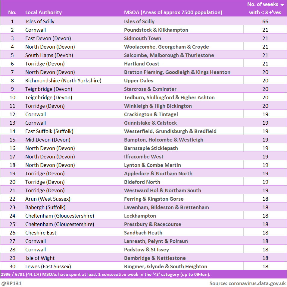 Bringing back the view of how many weeks the MSOAs have been in the suppressed 'less then 3 +ves in the last week' category. Since they don't allow us to distinguish between zero / 1 / 2, we generally consider it to mean zero. Link to full table in reply below.