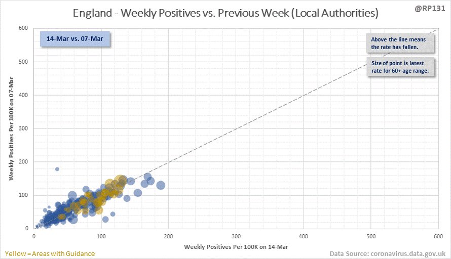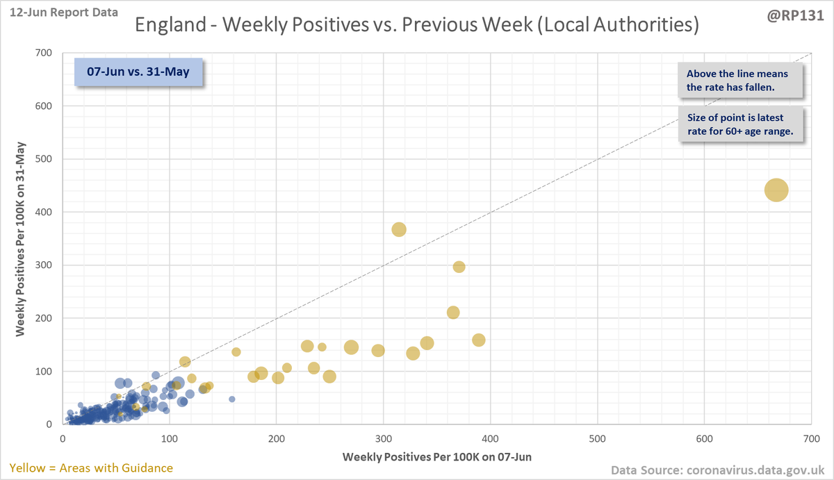 Bubble chart thread for England local authorities. This type of chart allows us to quickly visualise week on week changes by seeing if the points are above or below the dotted line. The size of the dot is the relative level of positives in the 60+ age range.