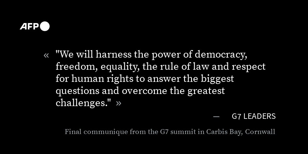 #UPDATE G7 leaders vowed to start delivering one billion doses of Covid vaccines and to step up action on climate change, in a summit call to arms by a revived democratic alliance that also confronted China and Russia u.afp.com/UXnY