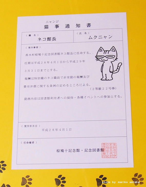 О назначении есть служебная записка, где указаны данные кота, дата действия контракта (обновляется каждый год 31 марта – в Японии финансовый год с 1 апреля), а также должностные обязанности (сопровождать посетителей и участвовать в мероприятиях музея).