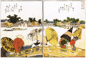 В те годы считалось неуместным для самурая пользоваться зонтом (и выглядит нелепо, и оружие не сможет резко выхватить, да и вообще не пристало отважному воину перед природой склоняться и в нелепой позе пытаться себе комфорт обеспечить).