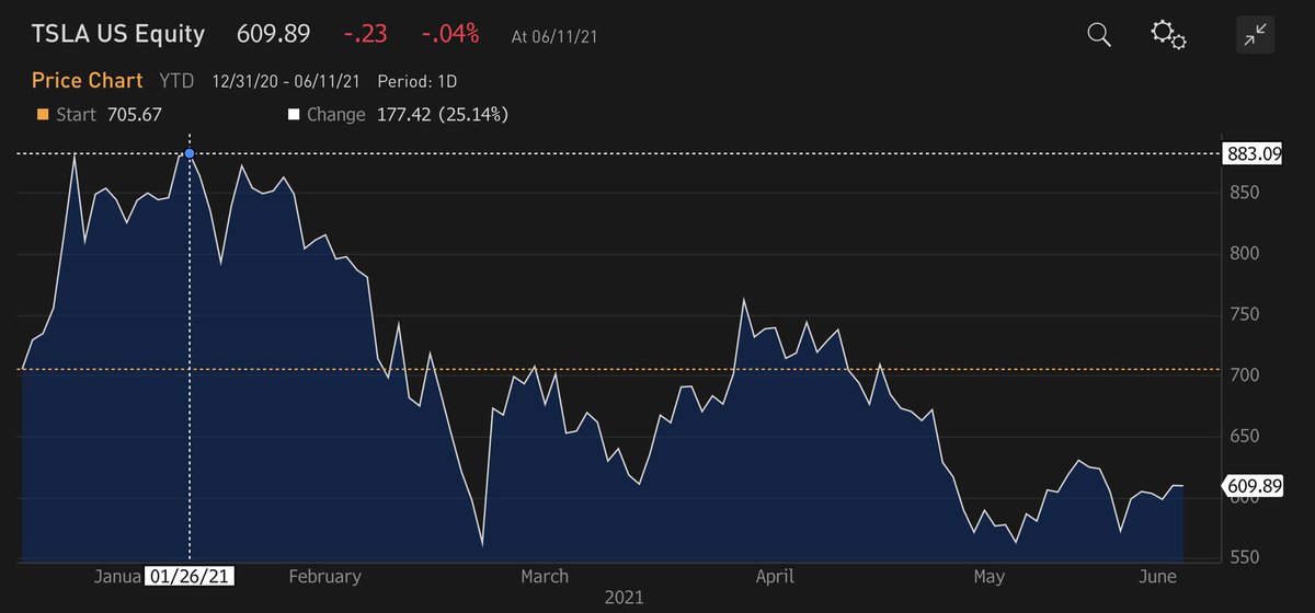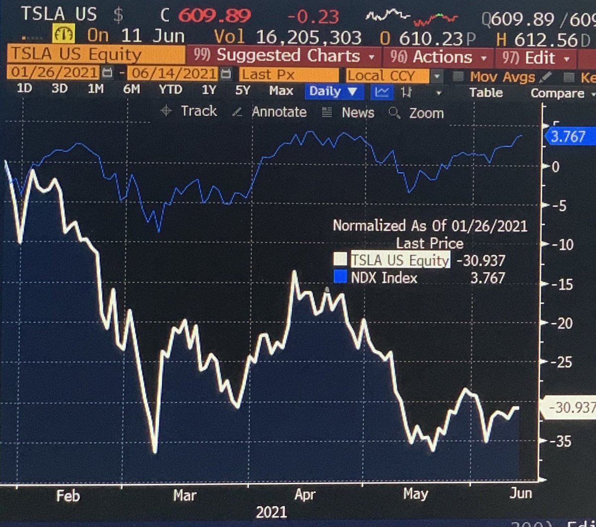 7/ $TSLA stock fell -36% in the next 40 days, vs NDX fell -8%. Long term Treas yields spiked from 1.05% to 1.74%, although they’ve since retreated to 1.47%. $TSLA is now -14% YTD, while Nasdaq 100 is within a hair from a new all time high, up +9% YTD.