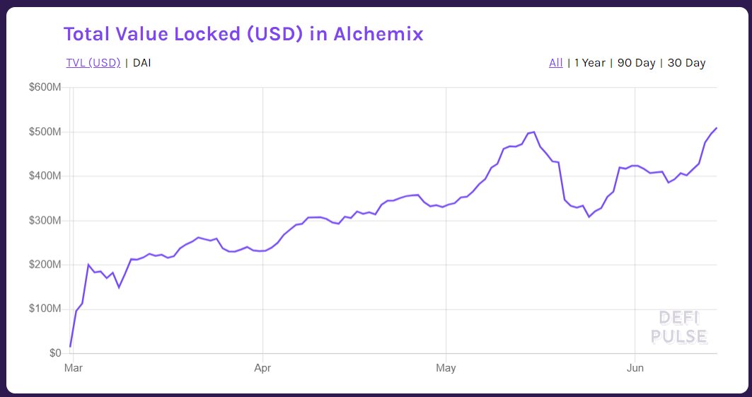 Alchemix tiene menos de 4 meses desde su lanzamiento a mainnet y considero que es uno de los protocolos más innovadores dentro del sector #DeFi. Básicamente, te permite depositar $DAI y tomar un préstamo de hasta el 50% de tu colateral en $alUSD, que es la stable del protocolo.
