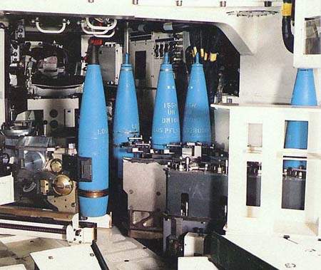16. The turret holds 30 ready rounds and 144 charges to propel them. More charges used per shot, further distance. The rounds can be of any NATO compatible type. Anti-tank top attack, guided, smoke, extended range, illumination, conventional...