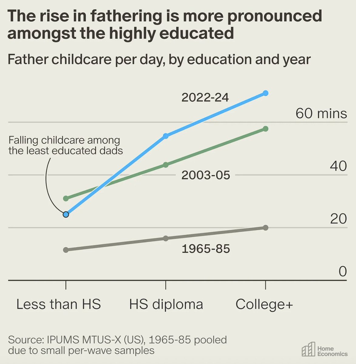 1. One reason father childcare time has increased so much in the last half century is that after the rise of the dual-earner household post-1960, many dads who took on more childcare realized that ... it was kinda nice? That they even ... liked their kids!?
