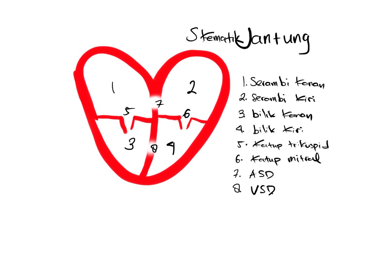 Jantung adalah organ yang memompa darah ke seluruh tubuh. Terdapat 4 ruangan utama di jantung yaitu serambi (atrium) kanan dan kiri, bilik (ventrikel) kanan dan kiri.