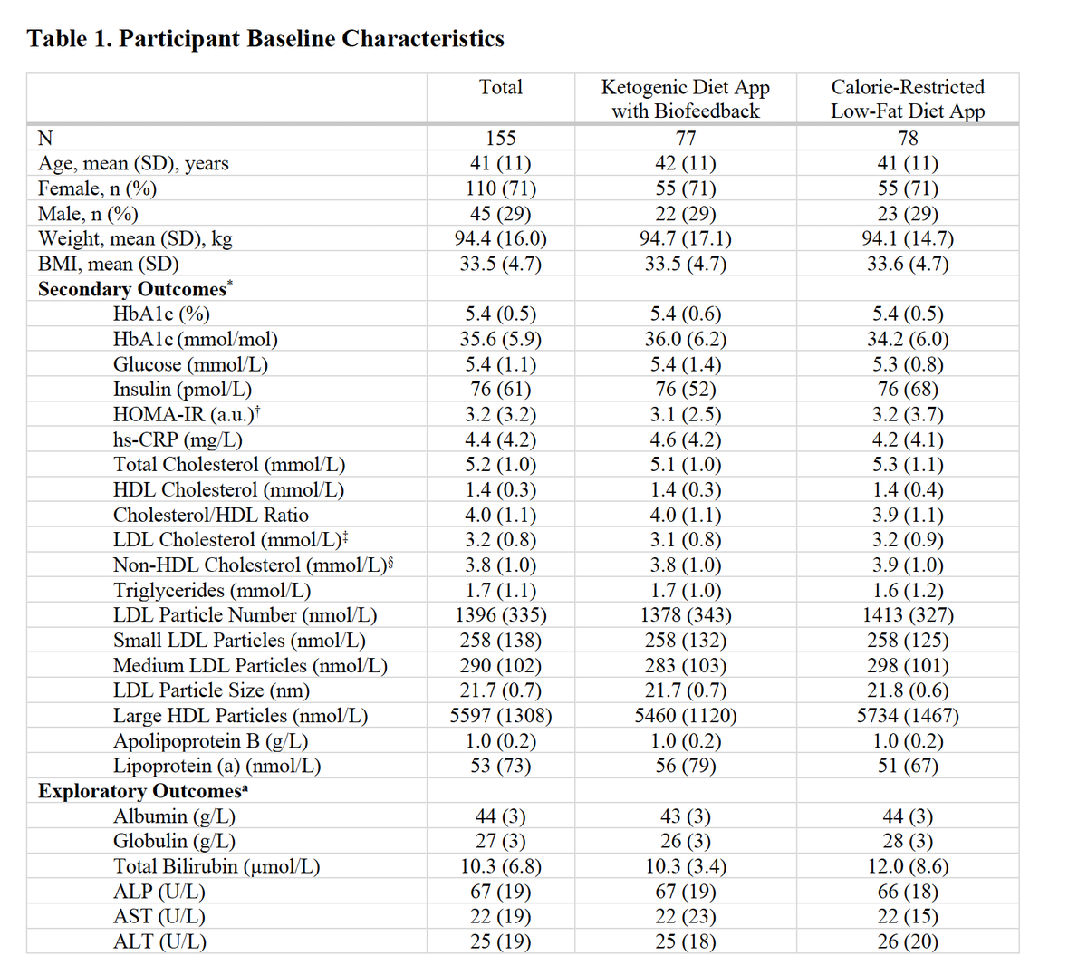 We ended up with 155 people (~70% woman) with an average age of 41, baseline weight ~95 kg and BMI ~ 34. Baseline A1C was 5.4% so this was a group of people with mostly overweight/obesity but not diabetes. Also randomization is beautiful