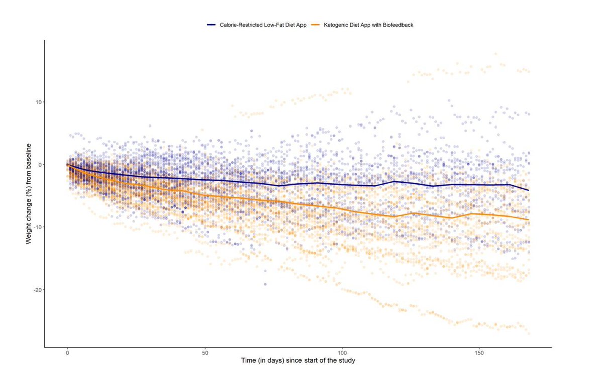 Here are the primary data: On the left, each dot represents an individual stepping on their wireless scale at home and solid lines showing the daily means for Keyto (orange) and WW (blue). On the right are the waterfall plots showing the percent weight lost for each individual