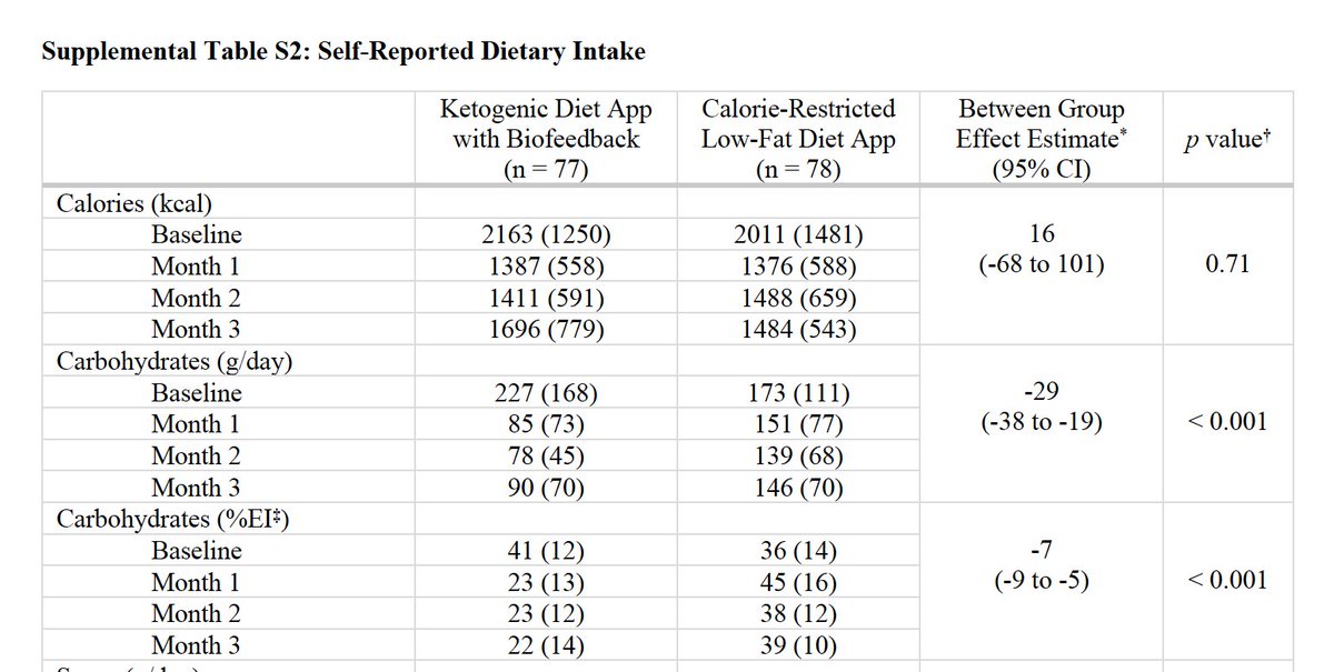 But what was most interesting was that both groups reported reducing calories but there was no difference between the groups. In fact, numerically, people in the Keyto group said they ate MORE than the WW group despite losing a lot more weight