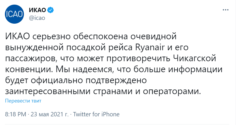 Акт вопиющего незаконного вмешательства в полет самолета Ryanair и оценку этому вмешательству дадут международные организации, в том числе @icao.