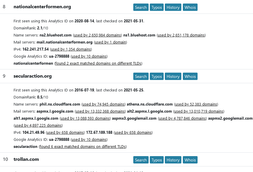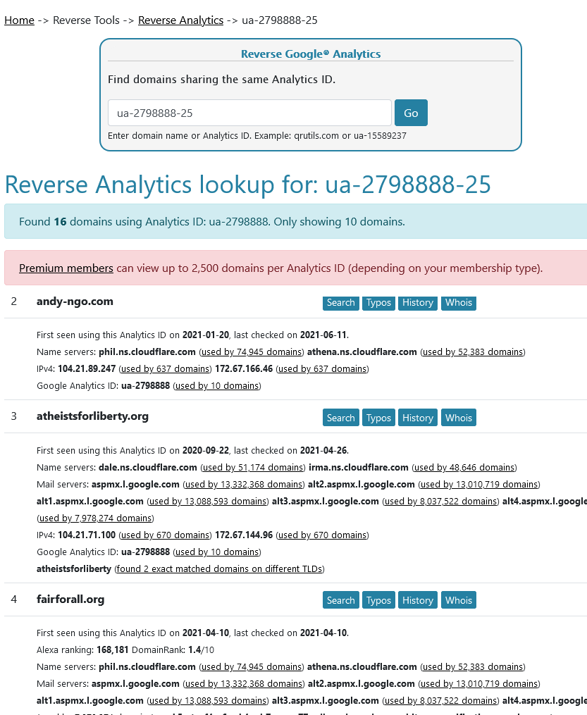 The ID for the Fair For All website is UA-2798888-25, which means it is the 25th site to use that ID. Using dnslytics.com/reverse-analyt… I fed that ID back in and found a few websites also using that same ID