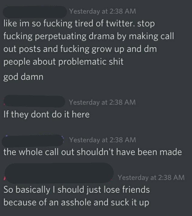 NOW. the crucial thing here... is that i did not write this thread to condescend to poc and/or play white savior (which funnily enough implies i gained something from all of this?). i wrote it because the people who TRIED to tell everyone got shut down.