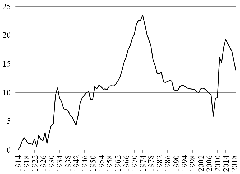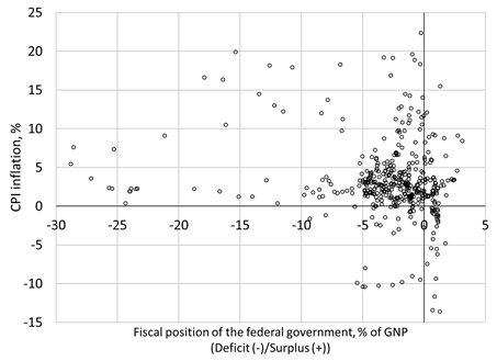 Figure 5. A century of fiscal balance and inflation, Q1 1914 to Q1 2021