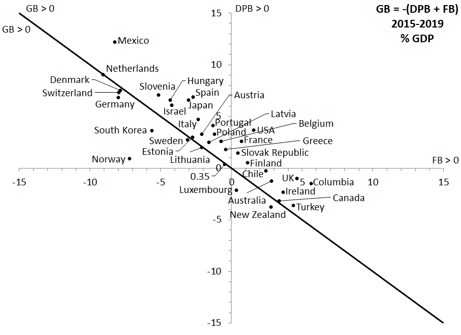 An animated GIF of the financial balances through time. OECD countries. DPB: Domestic private sector balance, GB: Government balance, FB: Foreign balance.