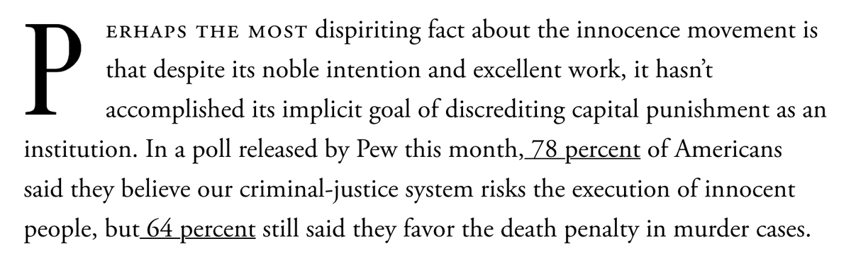 3/ Focusing on exonerating the innocent indicates that some capital sentences are unfair, but ultimately the fight should be waged not against particular injustices, but against the unjust system itself, Bruenig argues.