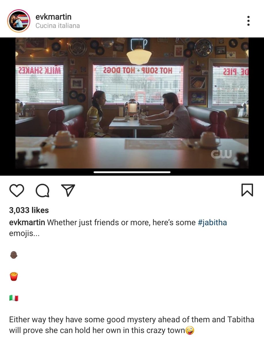 Though Tabitha isn't being tied to Jughead right away. Evan shared that his emoji hint was about them going to an Italian Restaurant. They're going the classic route of the six steps for romance (first kiss, rejection, etc.)