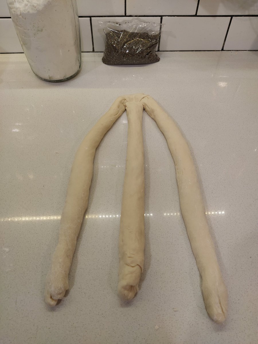 Precalentamos el horno medio/alto (180ºc), pintamos la trenza con la misma doradura, y la cubrimos con semillas de amapola. Si no tienen pueden usar semillas de sésamo o la que más les guste.
